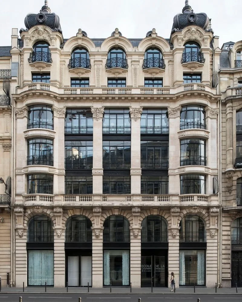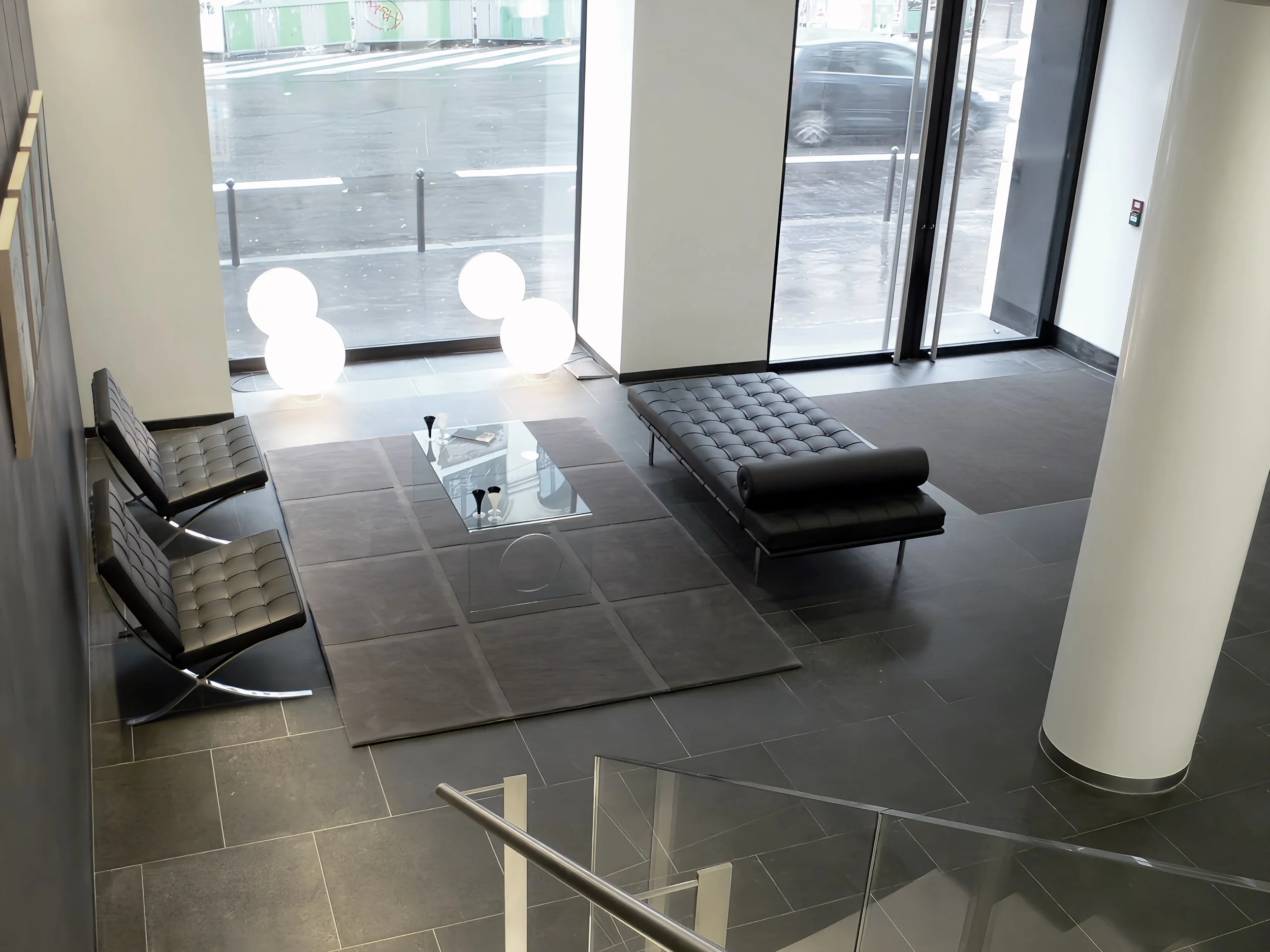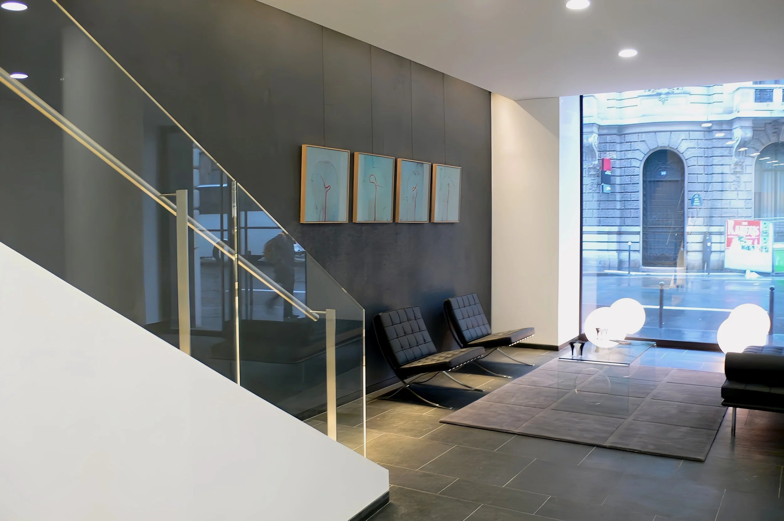 Le design du lobby constitue un contraste voulu par le client avec le classicisme de la façade. L’escalier et les garde-corps en verre ont fait l’objet d’une attention particulière, tandis que mobilier Mies Van Der Rohe insuffle une modernité subtile à l’espace d’attente. Depuis la rue, les lignes droites et blanches de l’intérieur dialoguent avec les lignes courbes et ocres de la façade, créant un jeu visuel captivant entre les deux époques.
