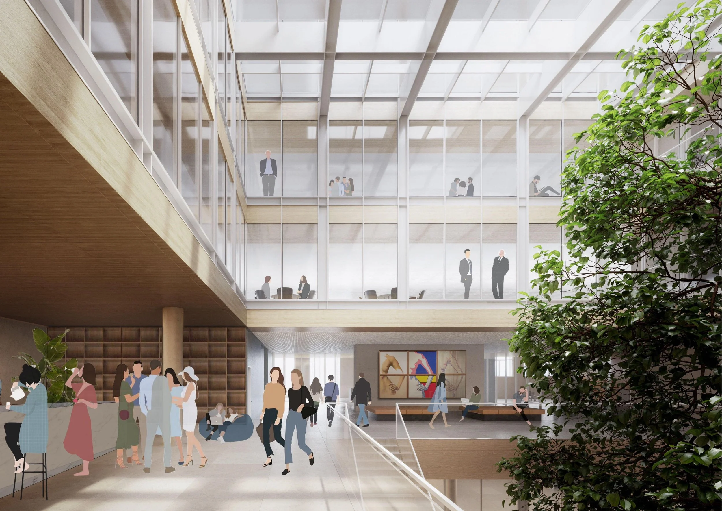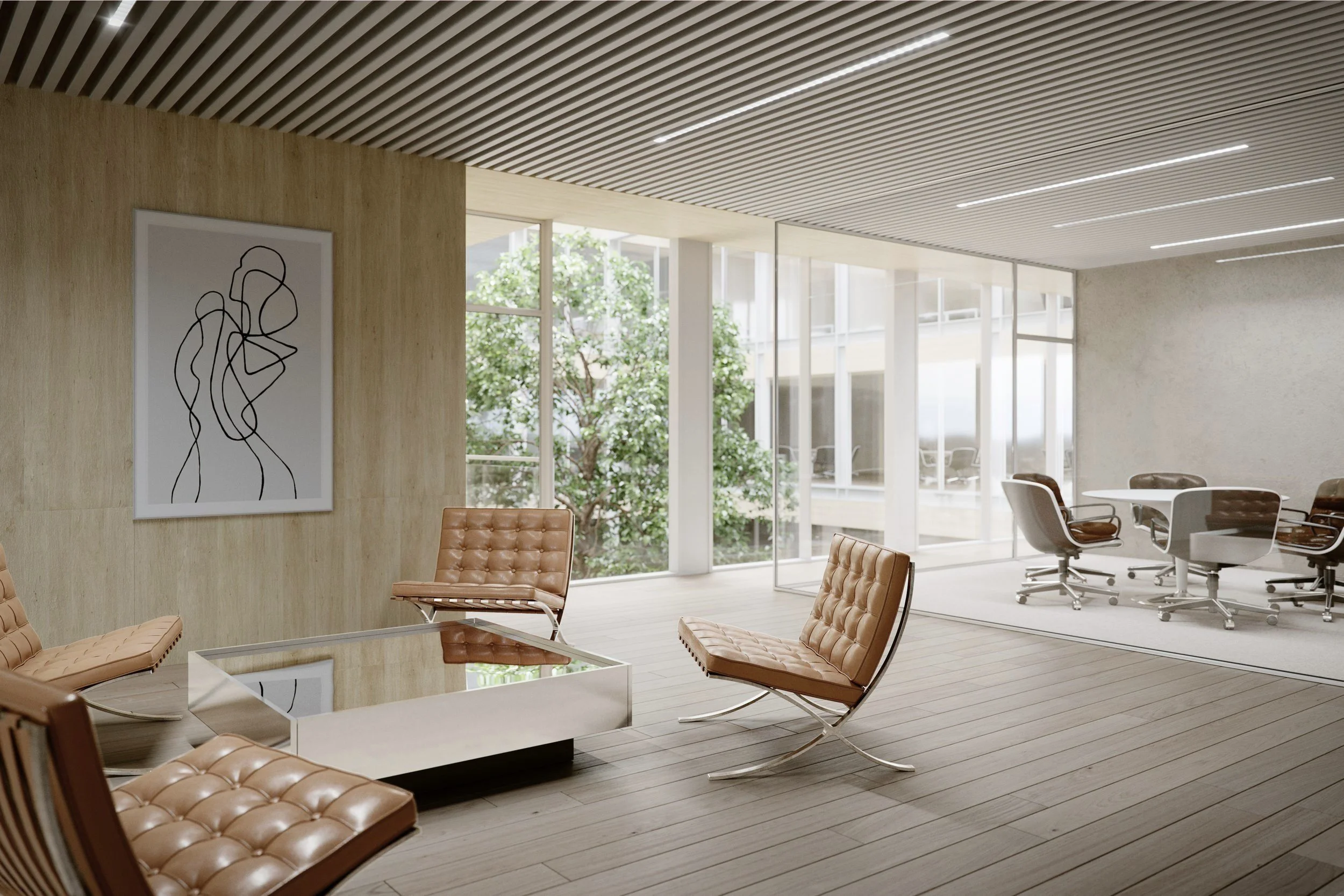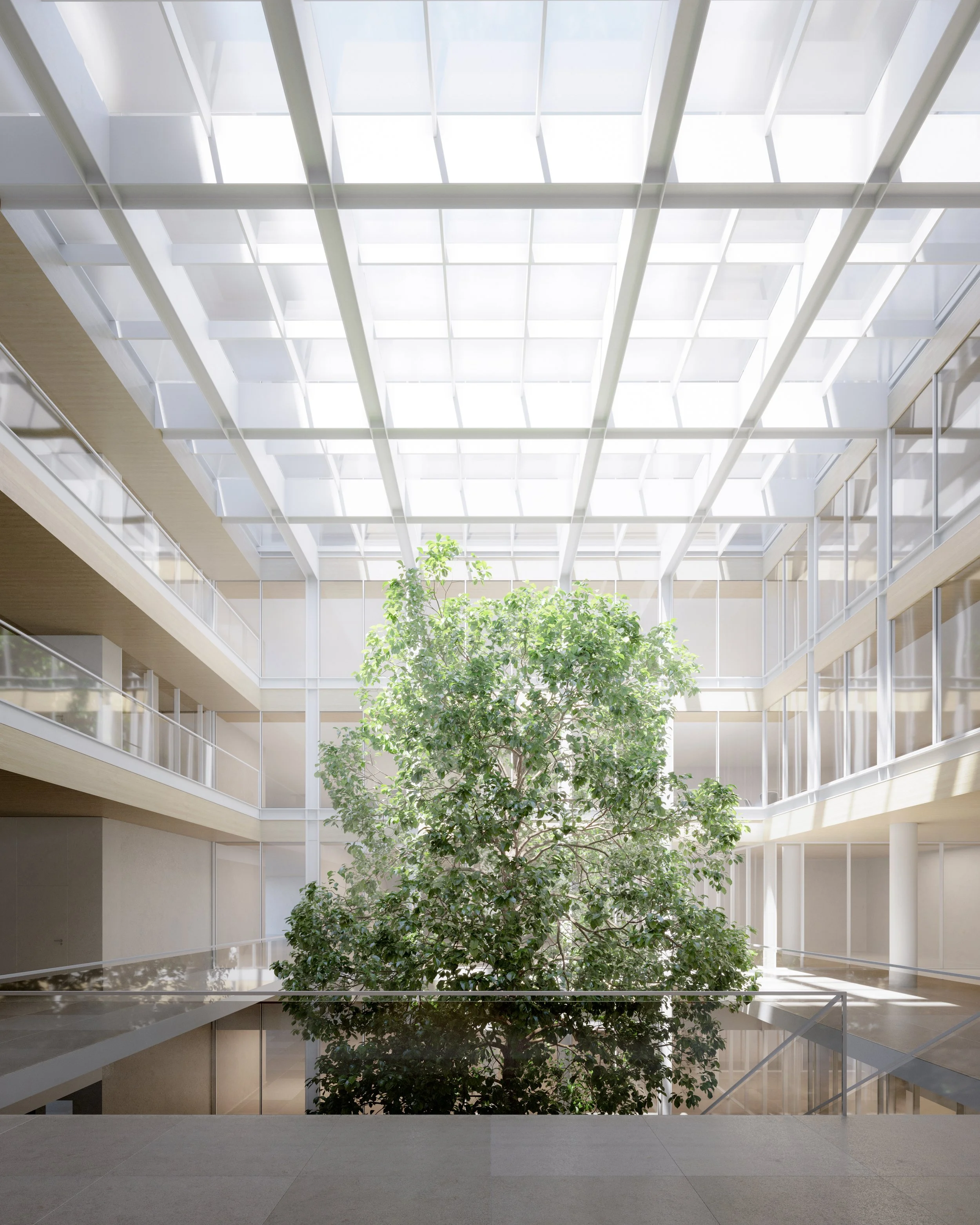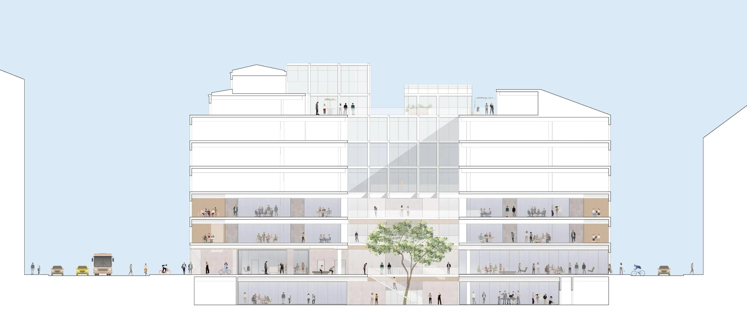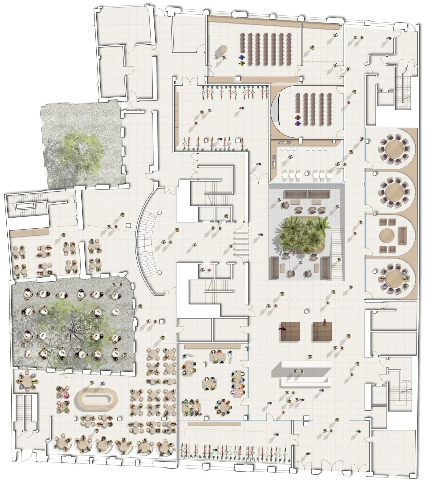 À l'intérieur, le projet propose une réorganisation complète des espaces pour les rendre plus flexibles et modulaires. L’idée est de favoriser des environnements collaboratifs tout en préservant des zones dédiées au calme et à la concentration. Les matériaux nobles et intemporels comme la pierre et le bois sont utilisés pour instaurer une atmosphère chaleureuse et accueillante, respectueuse du cadre patrimonial. Ce projet se distingue par son approche équilibrée entre conservation et innovation, offrant une véritable transition entre le passé architectural du quartier et les besoins futurs des entreprises. Bien que non retenu, ce concours incarne notre vision d'une réhabilitation respectueuse et contemporaine, capable de répondre aux défis d’aujourd’hui tout en honorant l’héritage du lieu.